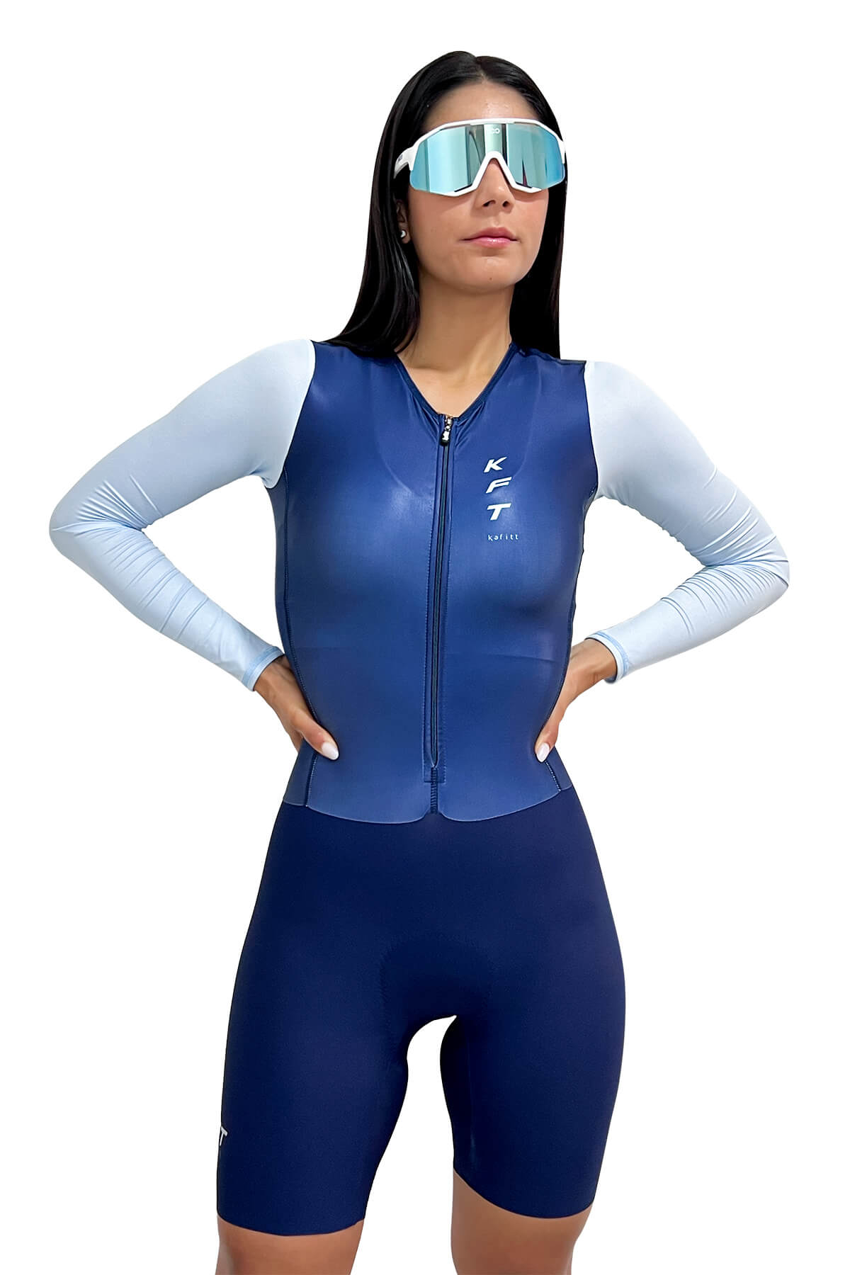 Enterizo de ciclismo Luxury, delantero y posterior en tela brillante y corte ajustable que realza la figura, mangas en tela liviana y microperforada, cuello bajo para lograr un fit aerodinámico, licra sin costuras elaborada en tela importada con banda de silicona en pierna, badana italiana microperforada, densidad de 120 duración en recorrido de 8 a 12 horas.